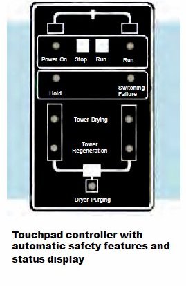 The controller also features a membrane panel housed in a NEMA 4X enclosure which clearly displays dryer operation with LED indicators for each step in the cycle sequence.
