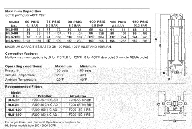 Models HLS-55 through HLS-150 deliver a low -40F dew point to protect pneumatic equipment and processes from the harmful and costly effects of compressed air moisture.